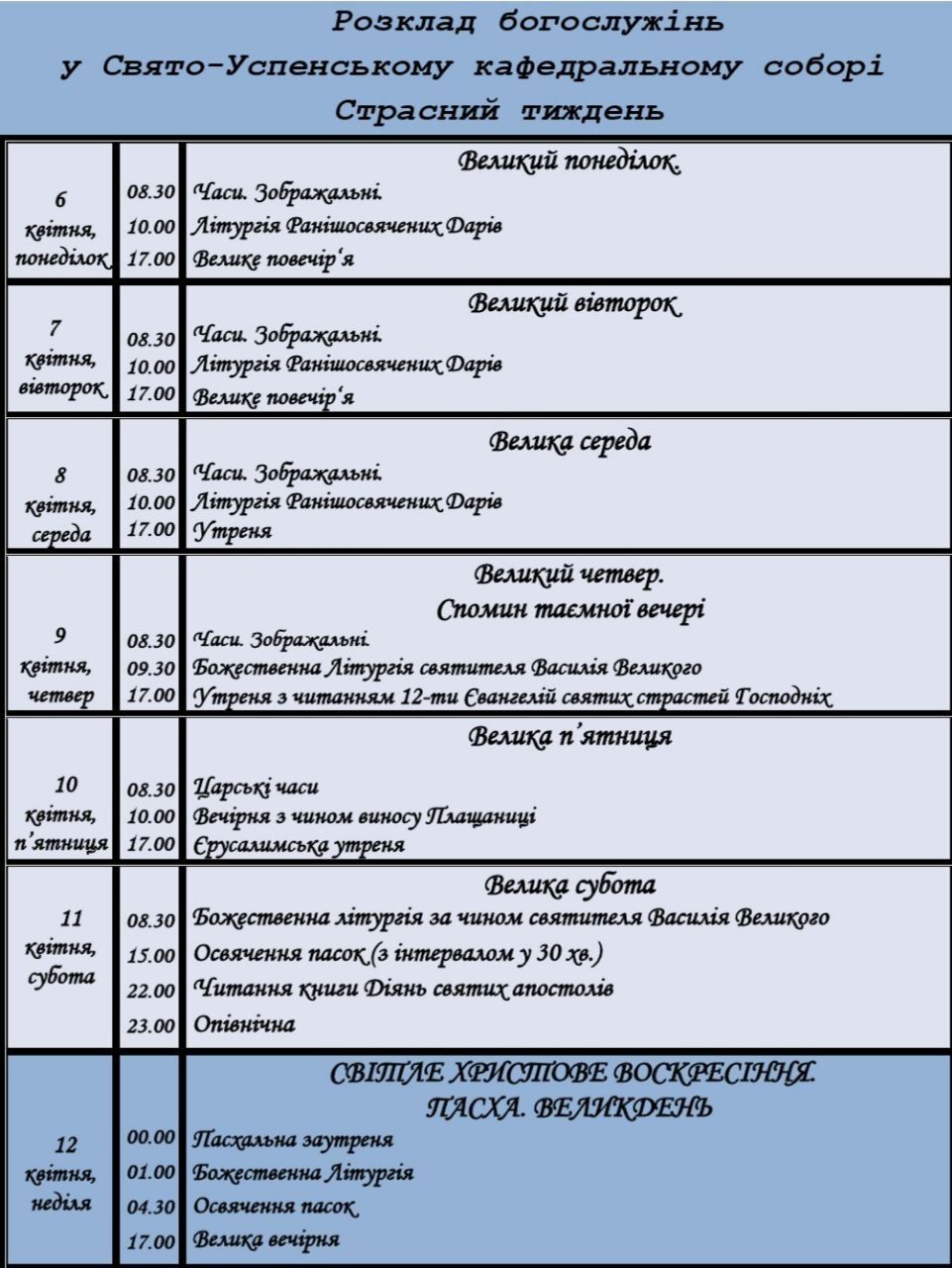Полтавців закликають уникати масового скупчення людей у місцях проведення богослужінь. Під час проведення релігійних обрядів дотримуватись правил безпеки громадського порядку. У разі сигналу «Повітряна тривога» швидко, без зволікань і метушні, пройти до найближчого укриття.