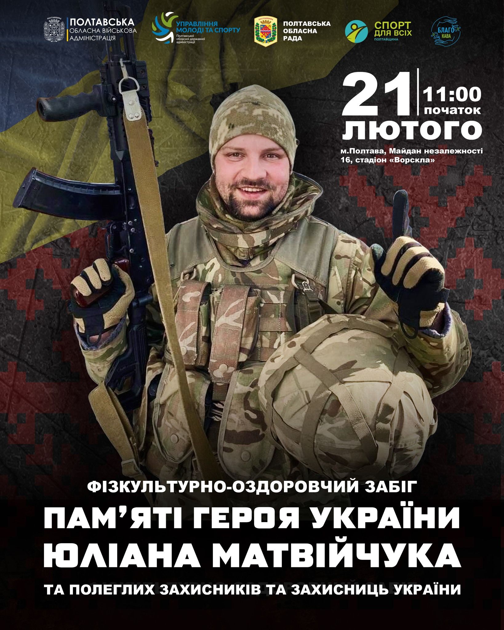 21 лютого у Полтаві відбудеться обласний фізкультурно-оздоровчий забіг «Памʼяті Героя України Юліана Матвійчука та Захисників і Захисниць України».